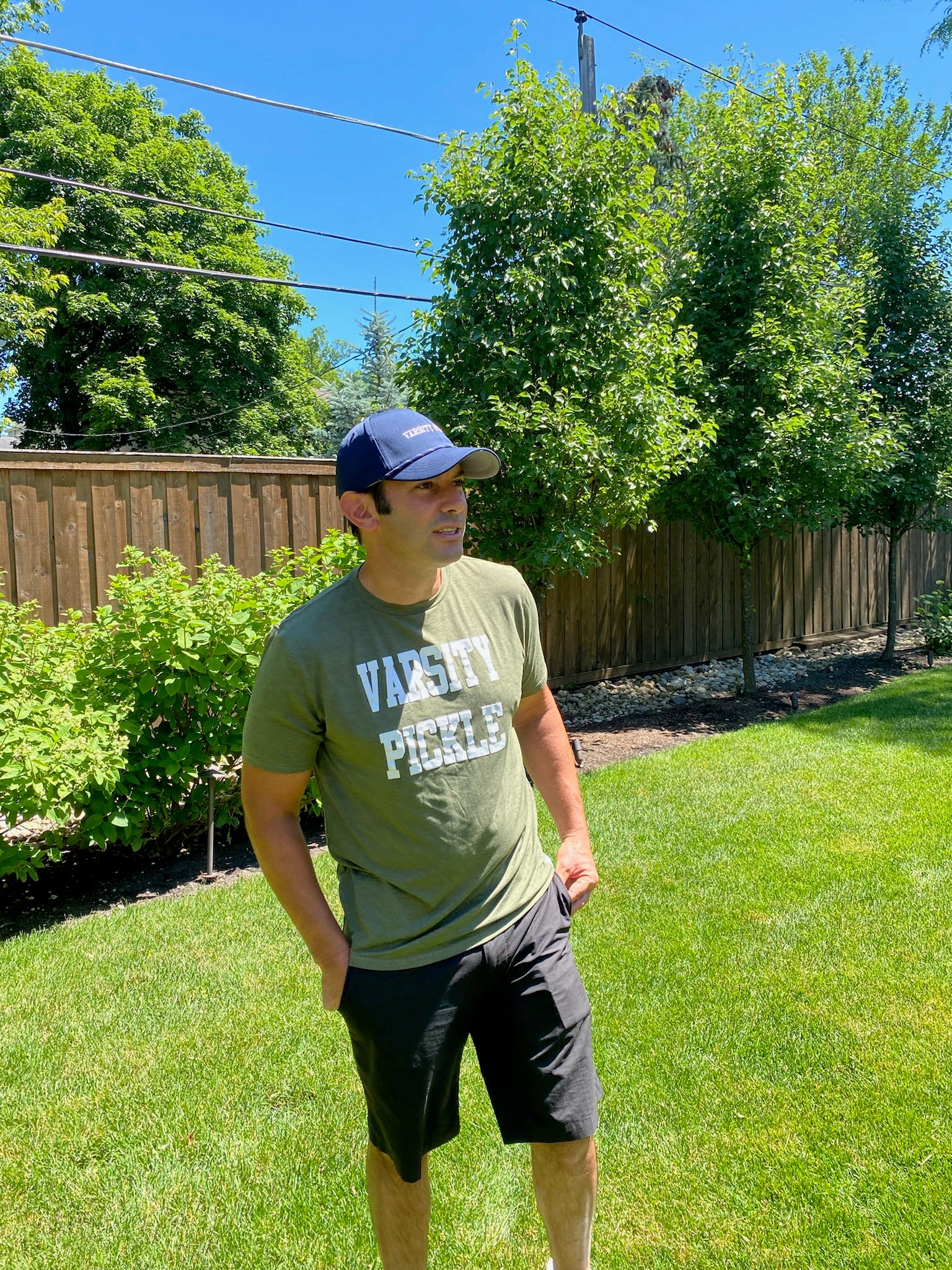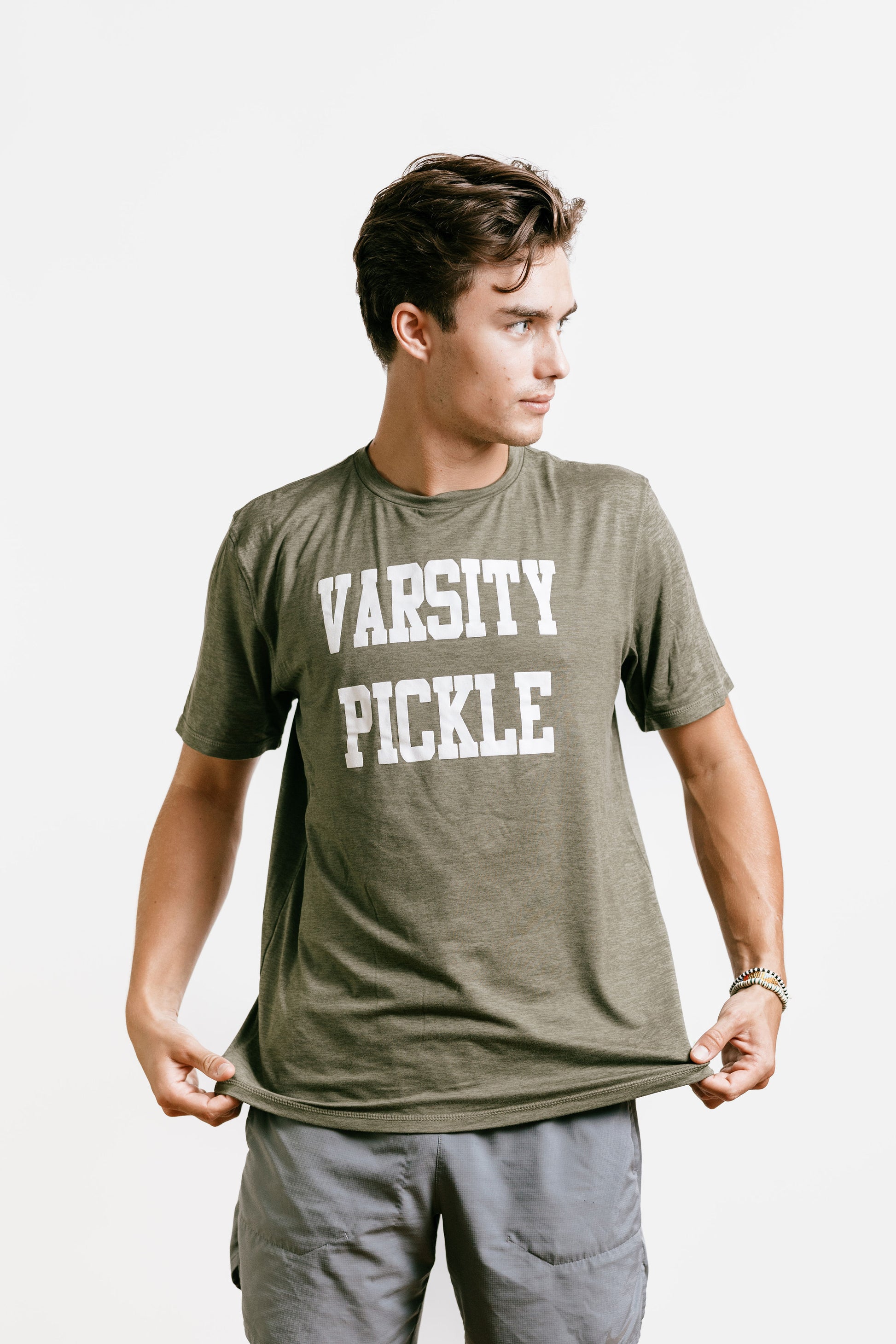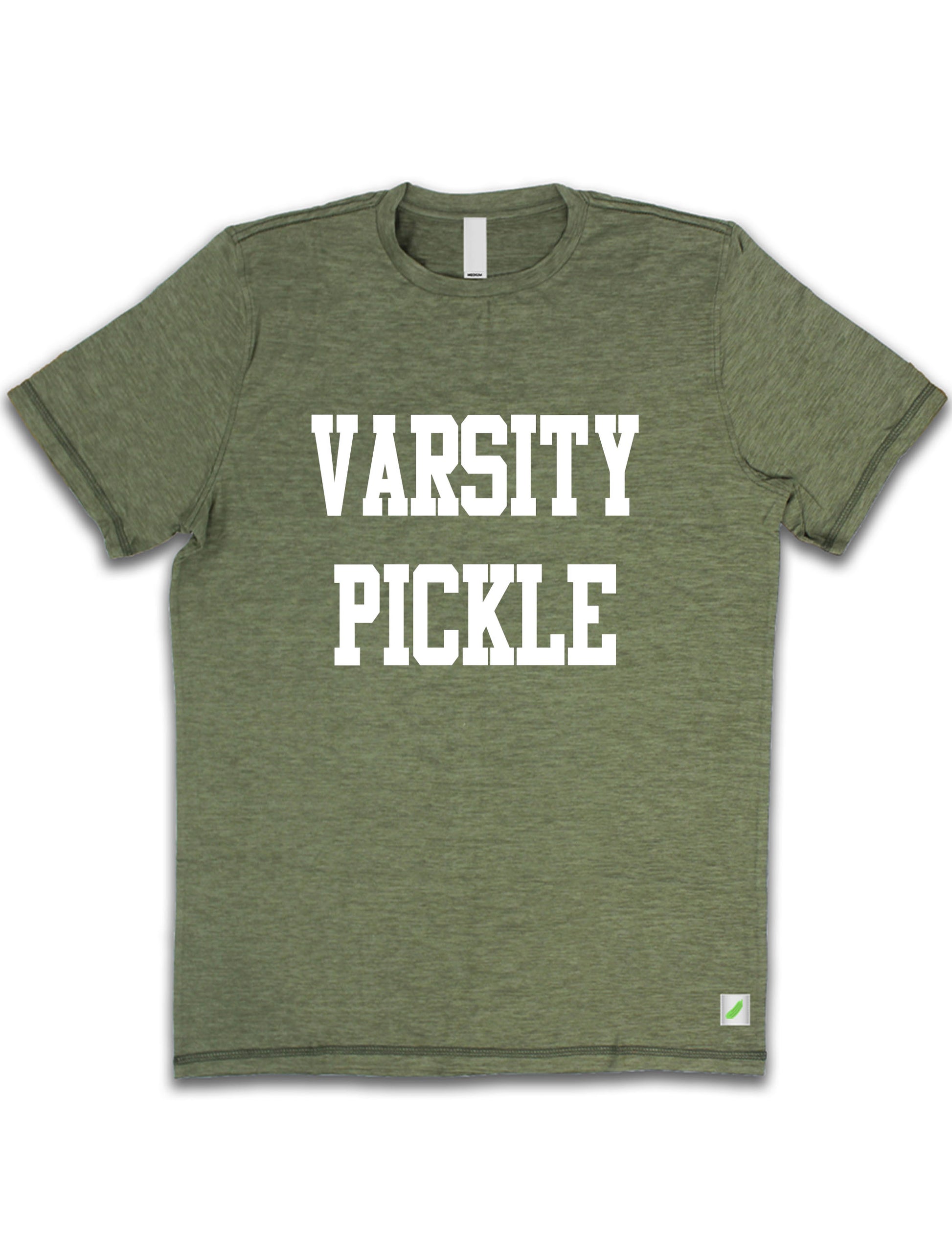The design features our retro collegiate Varsity Pickle logo across the chest and a small pickle patch at the bottom. The shirt comes in army green or, if you're really feeling it, pickle green.