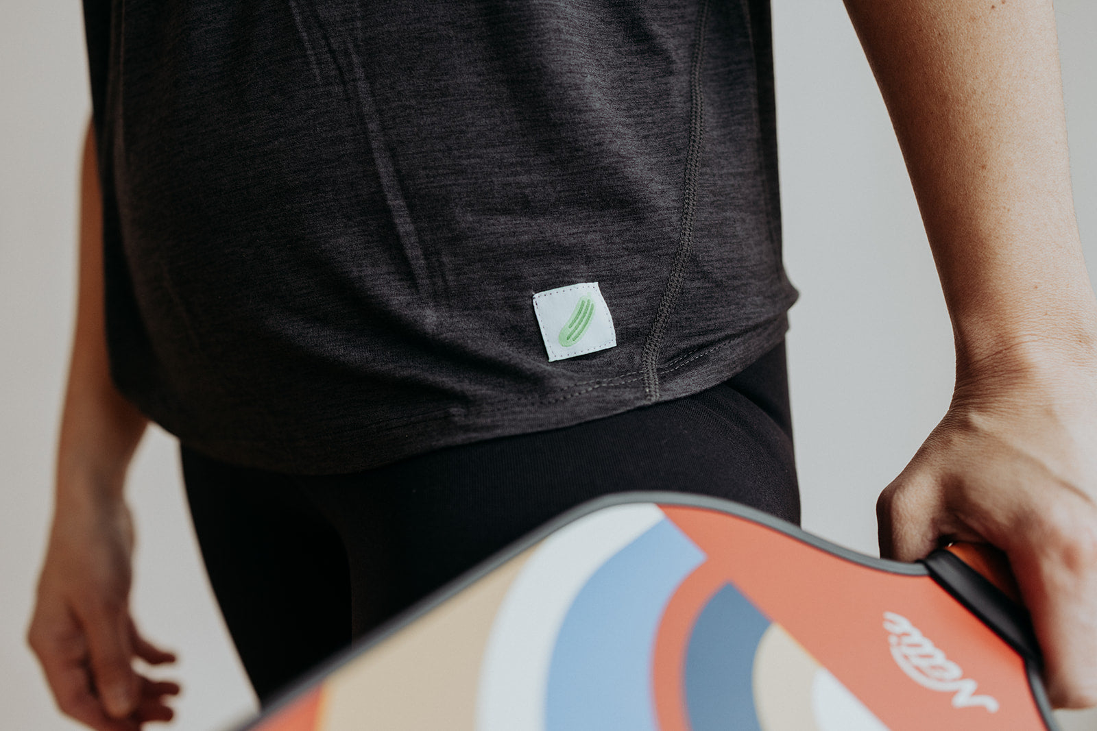 The design features our distressed Varsity Pickle logo in the chest pocket area and a small pickle patch at the bottom.