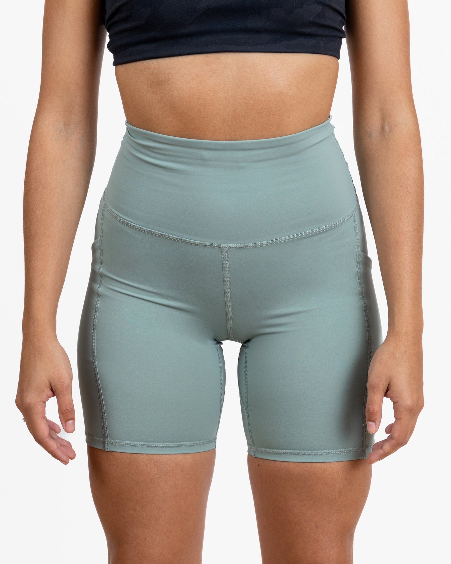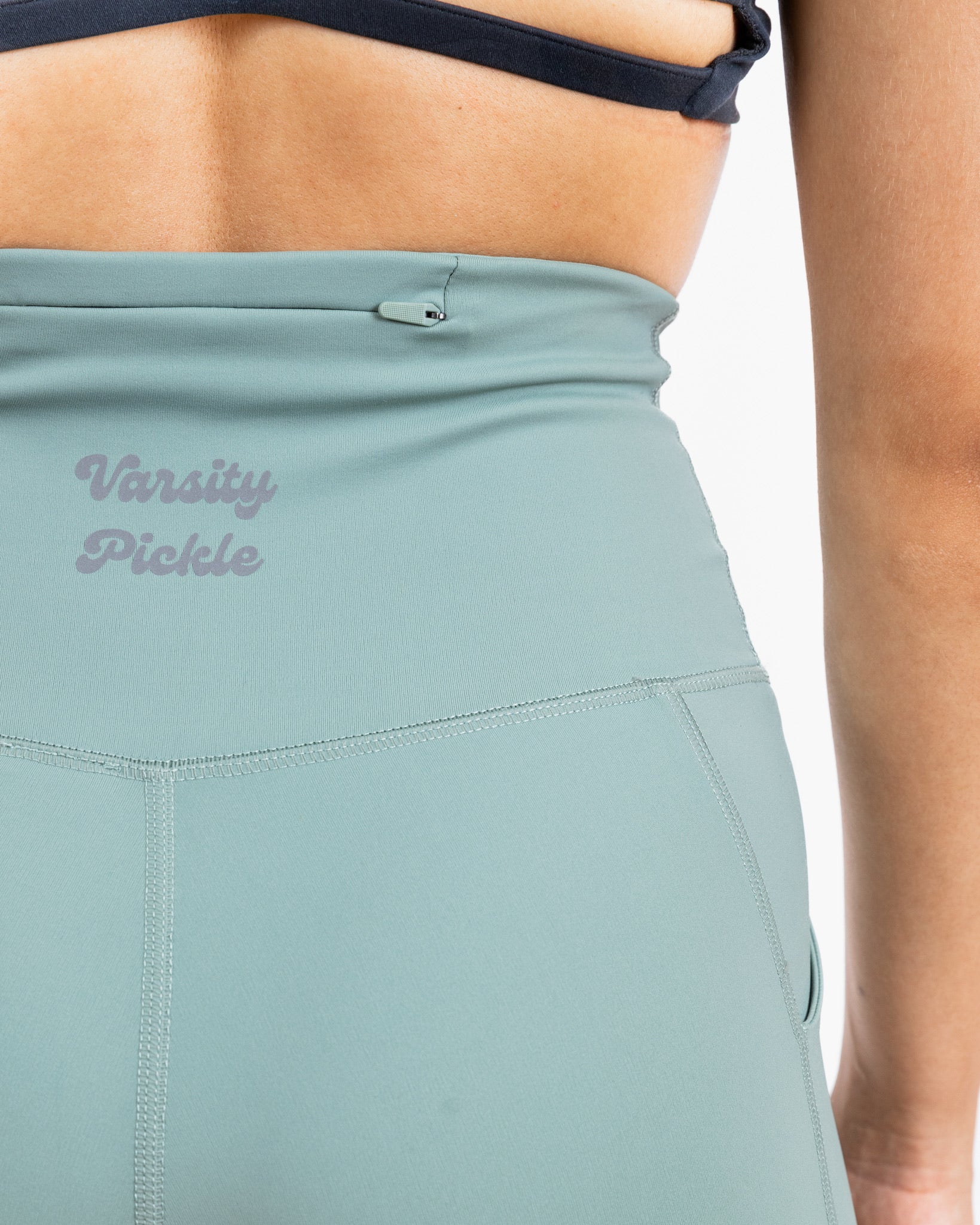 Wear our 7" sage green biker shorts while you play pickleball. These shorts are supportive and even come with a side pockets for your phone or an extra ball! The waistband at the back features a zip pocket and our reflective logo.