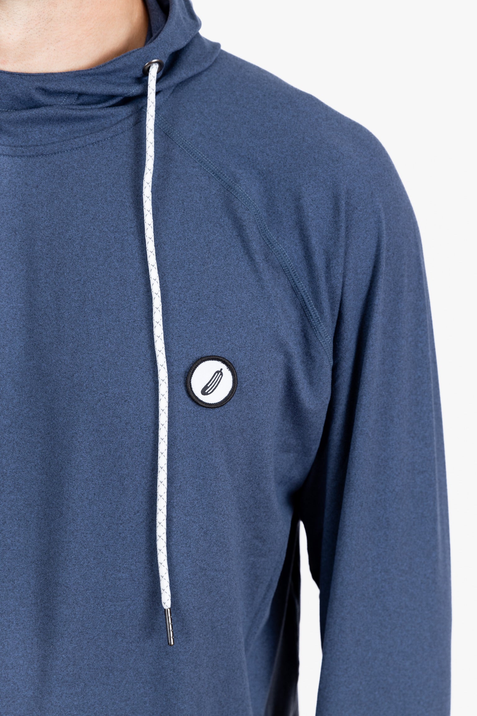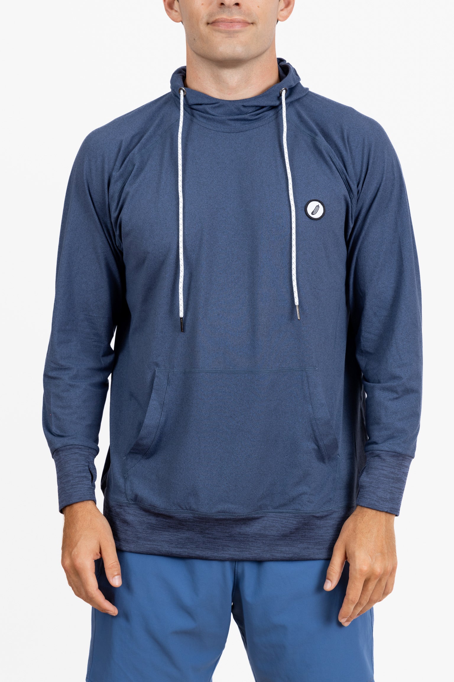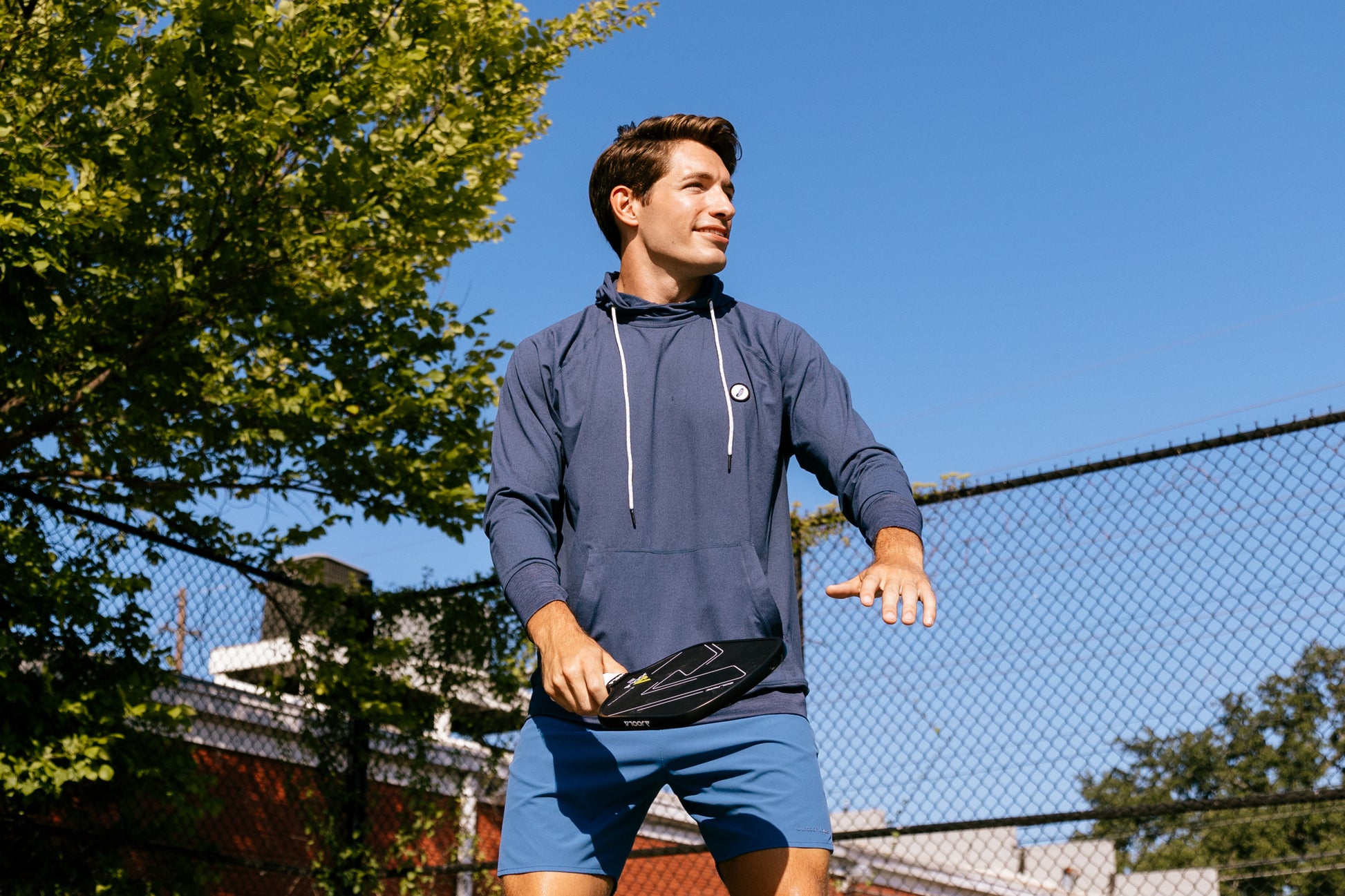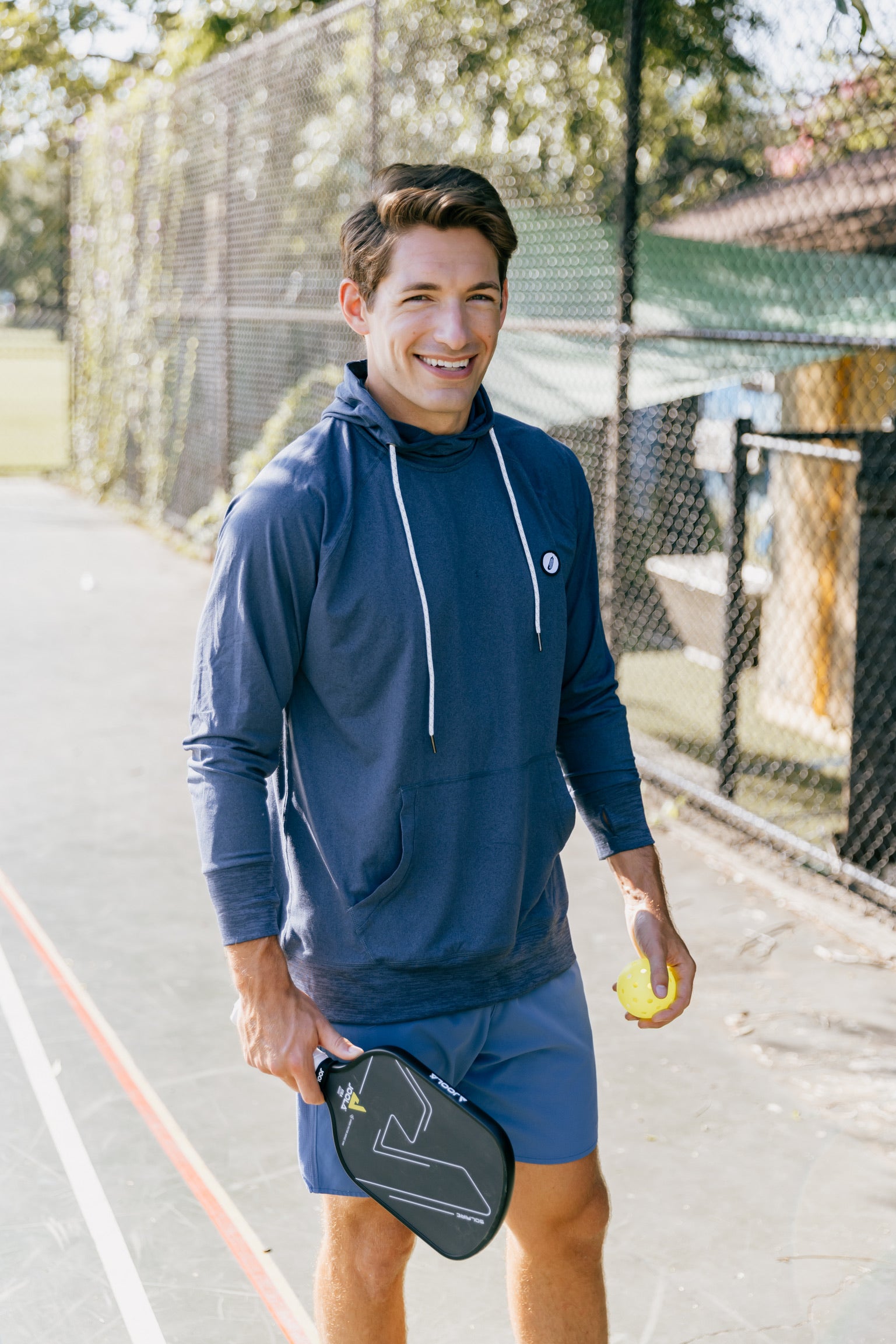 Our hoodie is made of our Navy performance wear material with a high neck and drawstring hood. It features a small pickle patch on your chest (so everyone knows you play pickleball) and thumb holes on the sleeves for warmth or security. It's warm for the colder weather games or sweat-wicking and has built in SPF, if you want to wear it for sun coverage too.